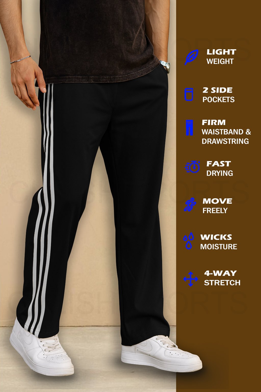 Upgrade your activewear with these men’s 3 stripes trackpants, designed for comfort, performance, and everyday style. Made from lightweight, breathable fabric, these sports track pants feature two side pockets, elastic waistband with drawstring, and fast-drying material, making them ideal for gym, running, walking, yoga, travel, and daily wear. The classic three stripe design adds a trendy athletic look perfect for casual outfits.